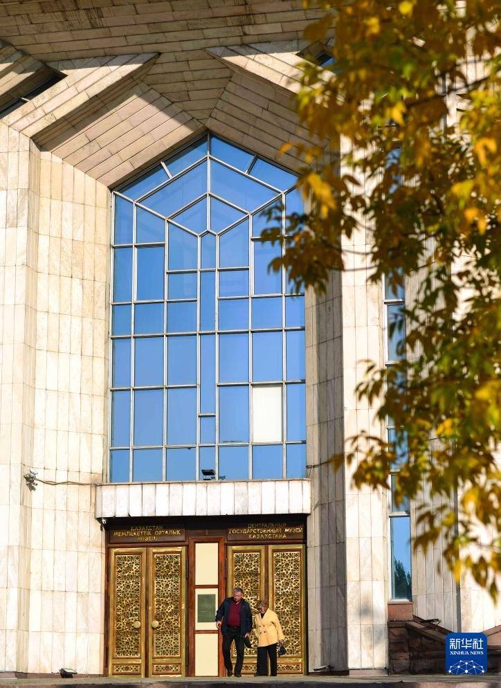 r10月6日,两名老人走出位于阿拉木图的哈萨克斯坦中央国家博物馆。