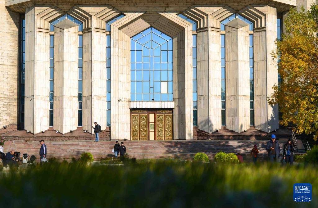 r10月6日,人们在位于阿拉木图的哈萨克斯坦中央国家博物馆门前休闲。
